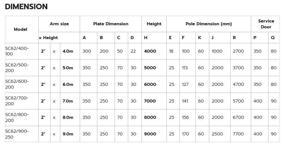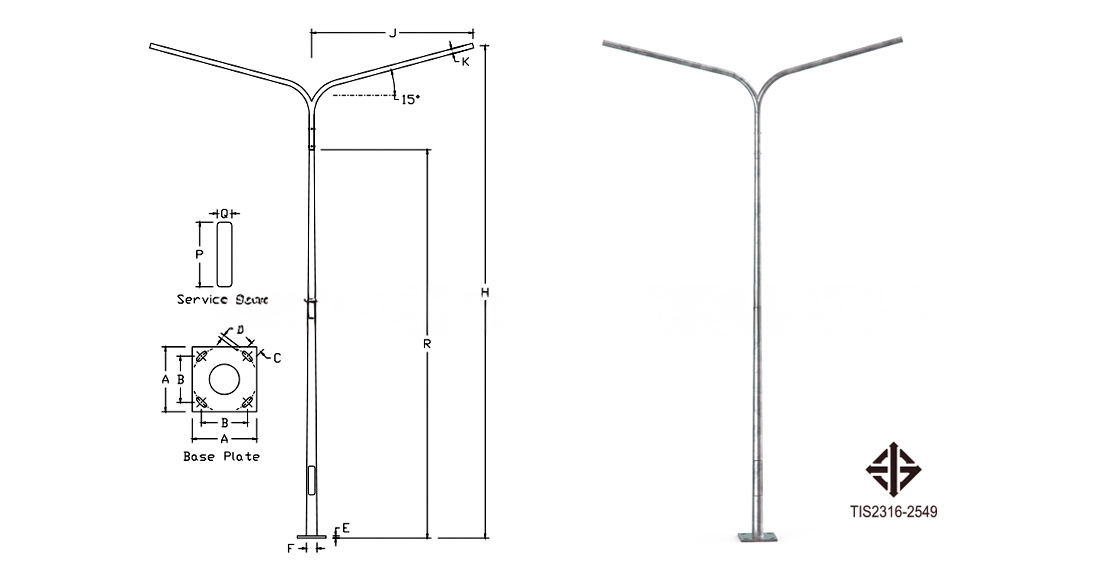 - เสาไฟถนนกิ่งคู่ มีความสูงเสาให้เลือกได้ตั้งแต่ 4-12 เมตร สูงสุดถึง 14 เมตร