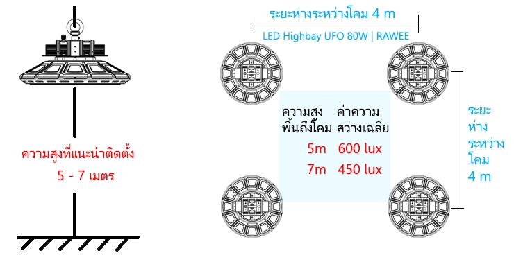 ค่าความสว่างเฉลี่ย(ลักซ์)ที่ระดับความสูงและระยะห่างระหว่างแนะนำสำหรับโคมไฟไฮเบย์ UFO